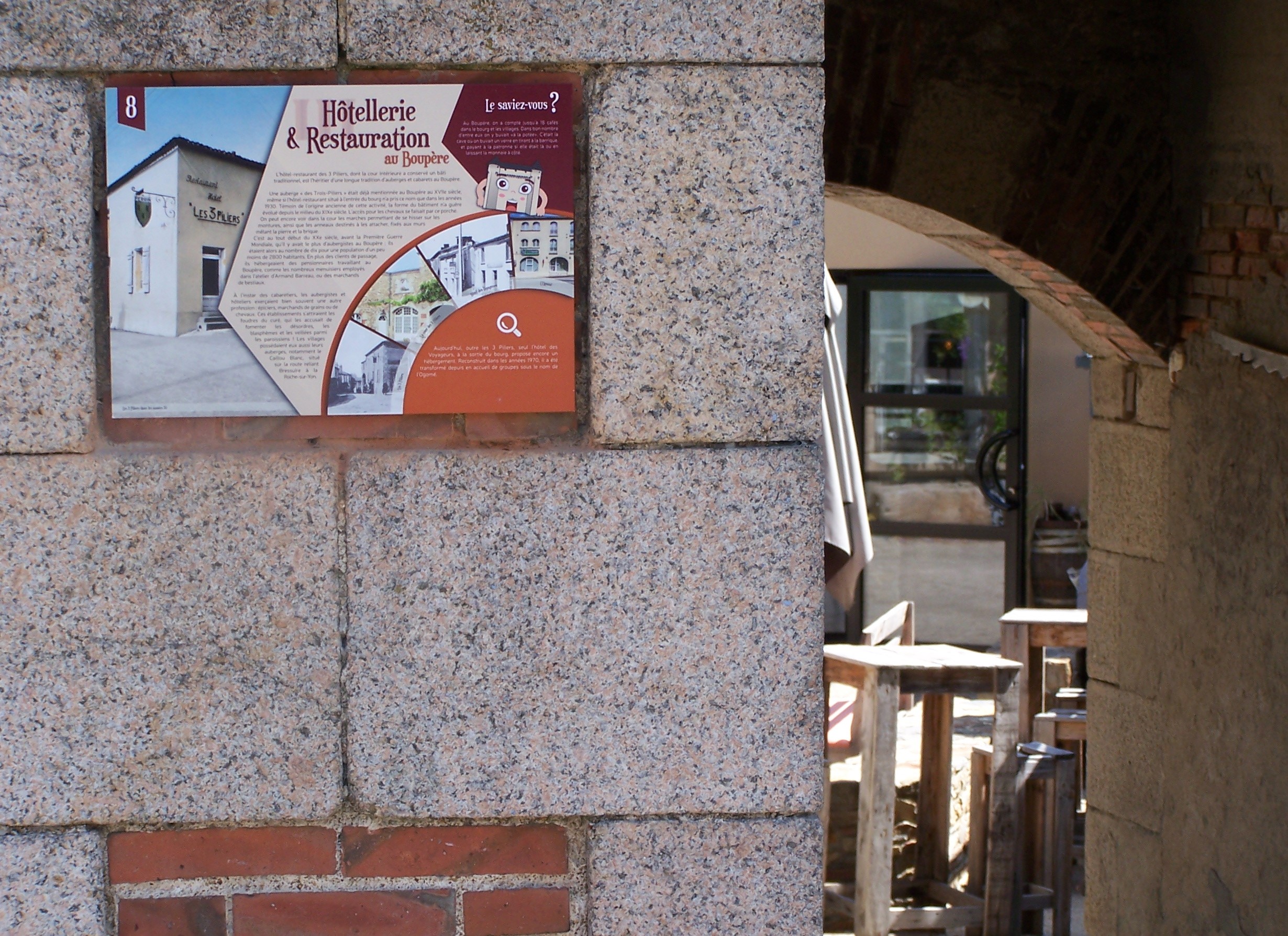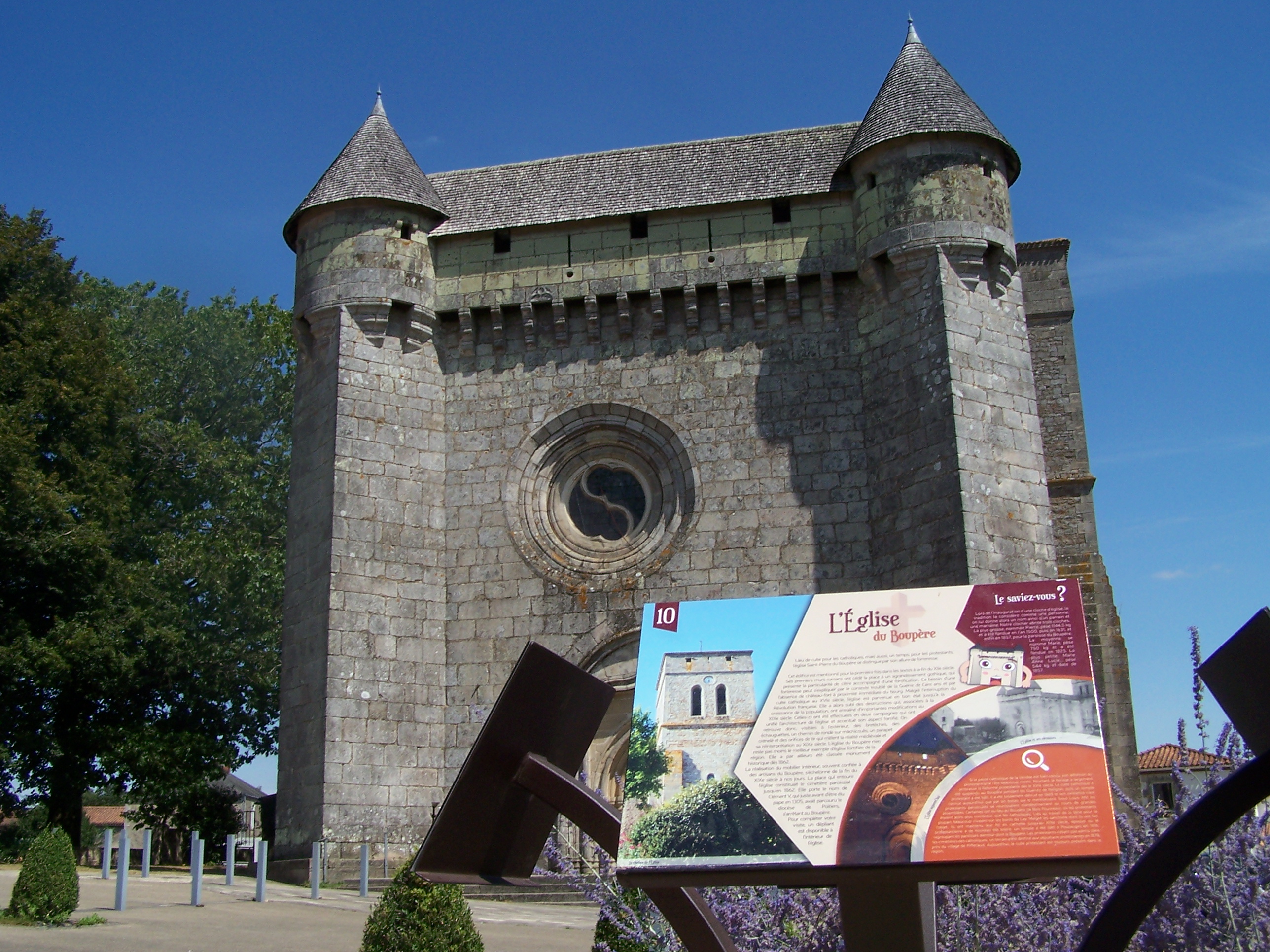 Jalonné d’étapes, toutes représentées par des panneaux numérotés, le parcours fait découvrir 10 points marquants de la commune. Ces étapes racontent, à travers les siècles et les personnages importants qui s’y rapportent, les grandes pages de l’histoire du Boupère; également les particularités artisanales et industrielles des lieux. Notre coup de cœur à la 10ème étape: l’église fortifiée du 12ème siècle, à la fois imposante et mystérieuse par son architecture défensive et sa sobriété religieuse.