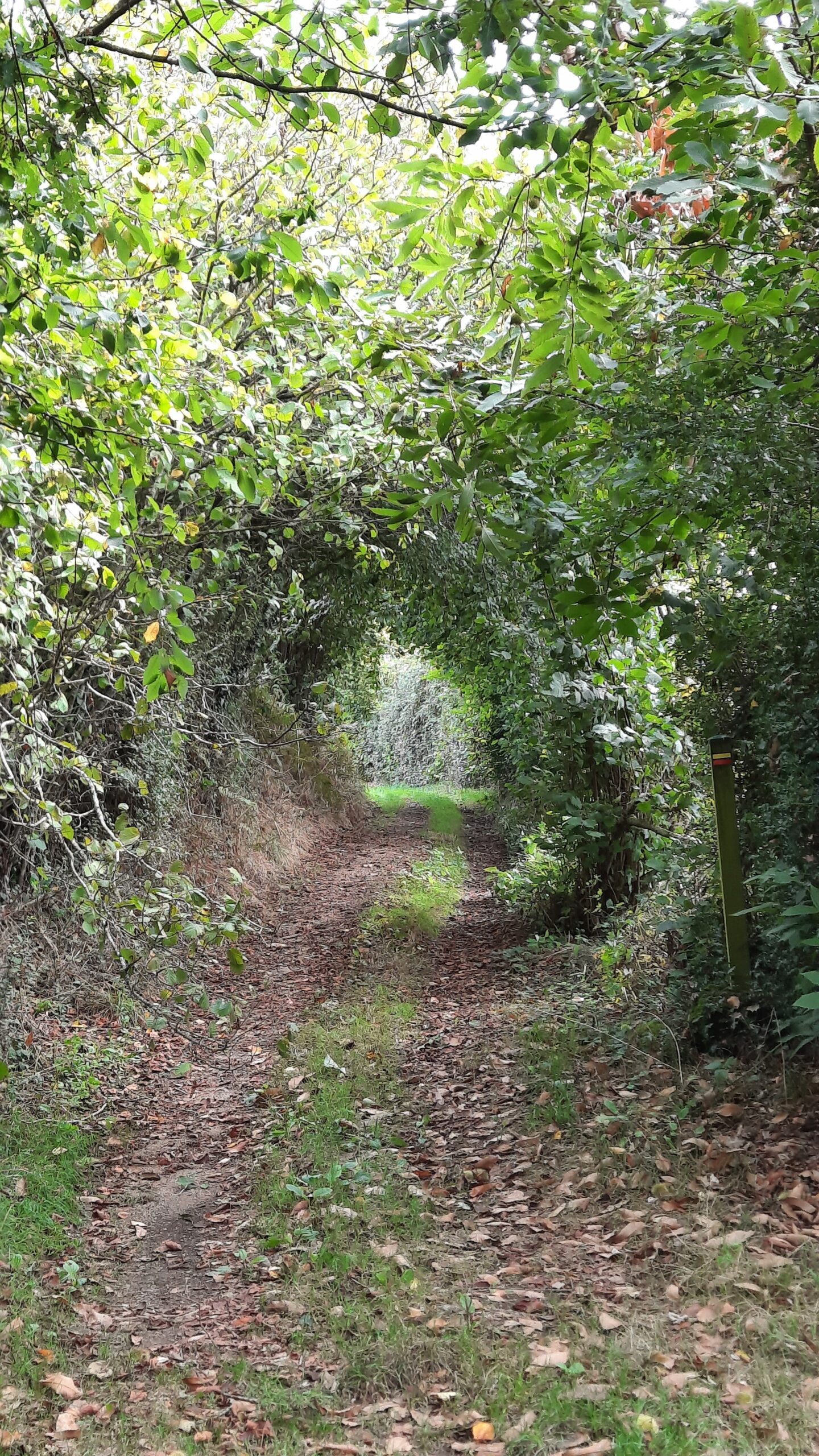 Une jolie découverte que ce tronçon. Des chemins creux, des chemins couverts & du dénivelé = tiercé gagnant ! Les chemins sont couverts de châtaignes tombées au sol, l’arrivée de l’automne est imminente. Le couvert végétal est encore là, la nature se révèle dans toute sa splendeur, et la qualité d’entretien des sentiers est un vrai bonheur pour la marche (merci aux baliseurs et aux associations de randonneurs pour leur travail tout au long de l’année).