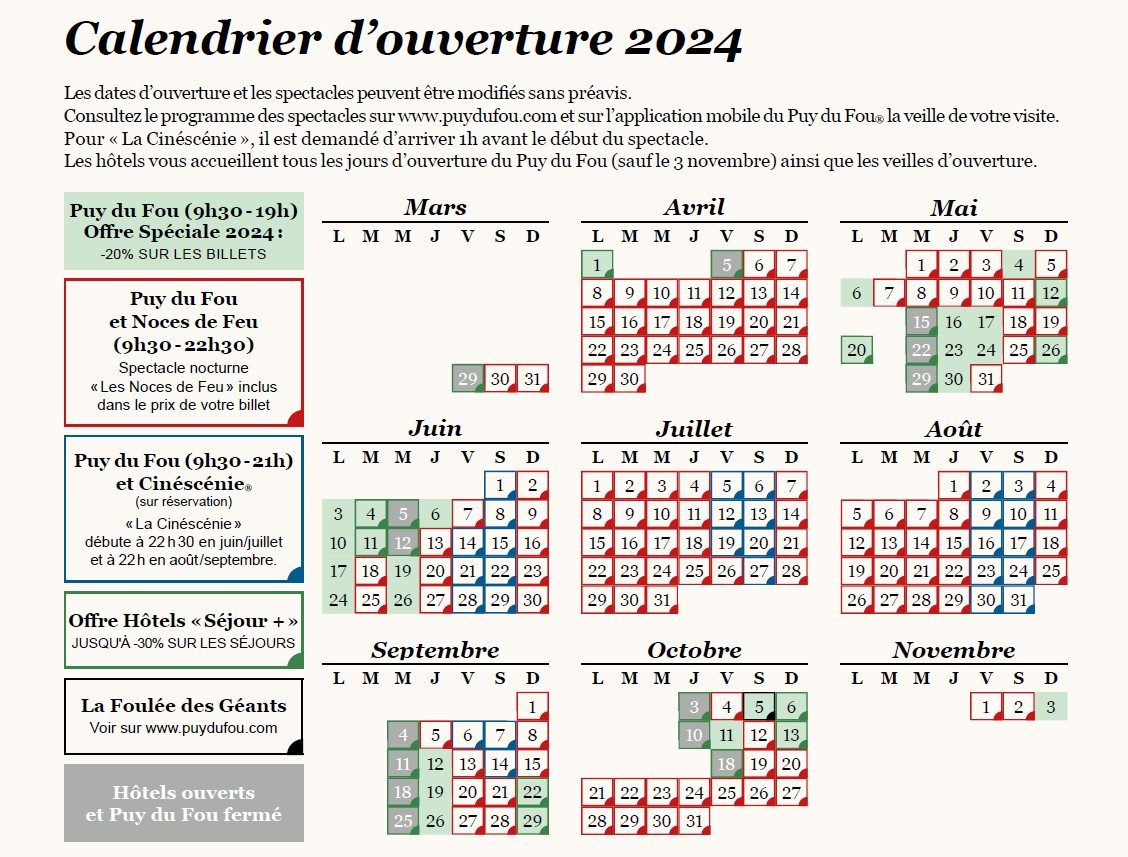 Pour vous aider à planifier votre venue, voici le calendrier d’ouverture du Puy du Fou.